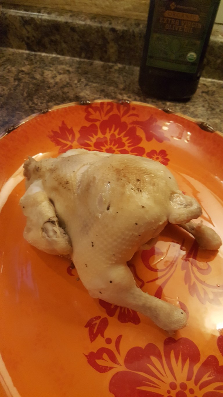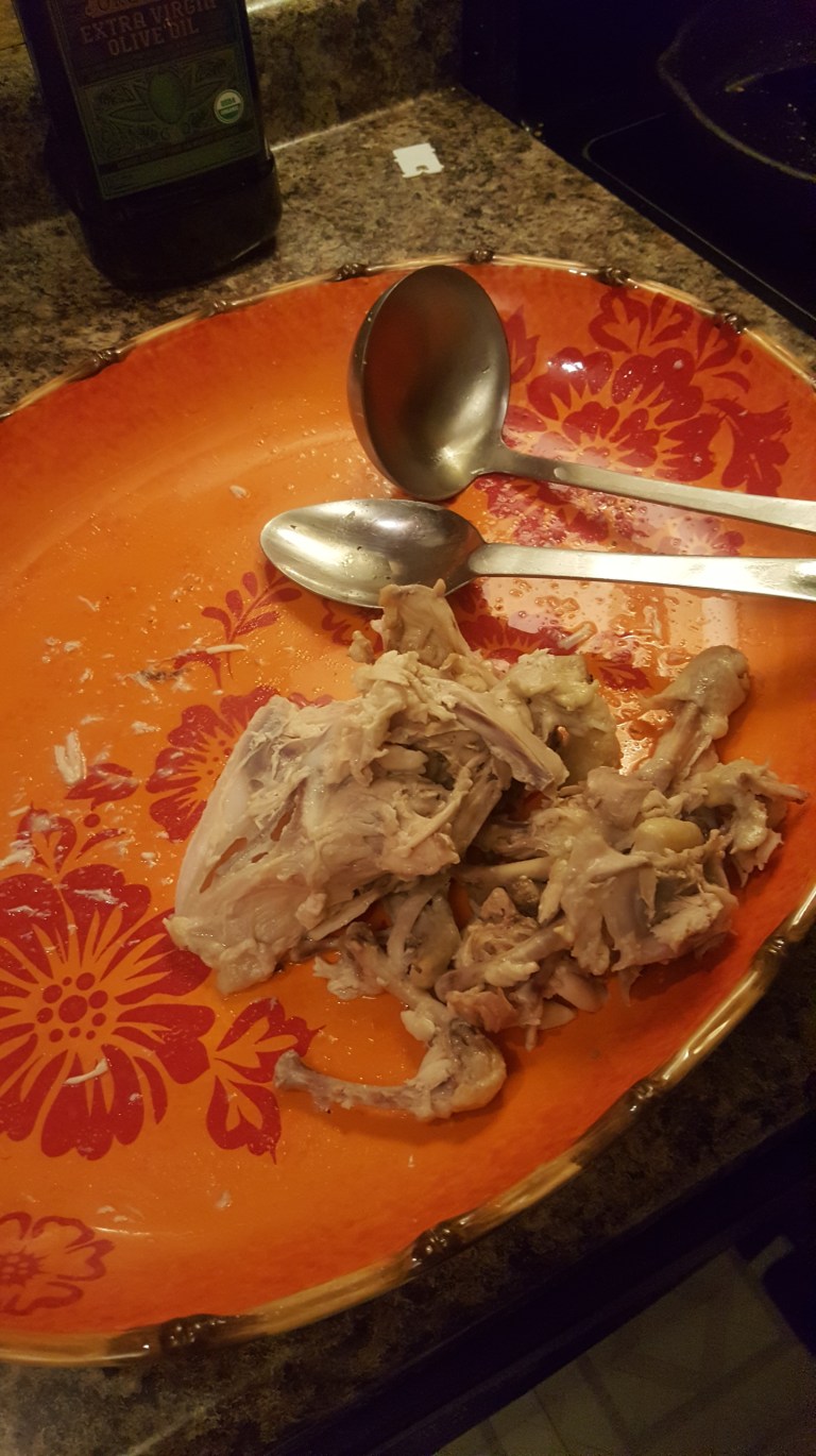 After about an hour, always check internal temp, I pull the chicken and set it on the side to cool down. I dont like burning my hands as I pull apart the chicken. You don’t want to over do it then it will fall apart in your broth and you will have to contend with bones in your soup. I keep the skin in a separate pile for further processing.