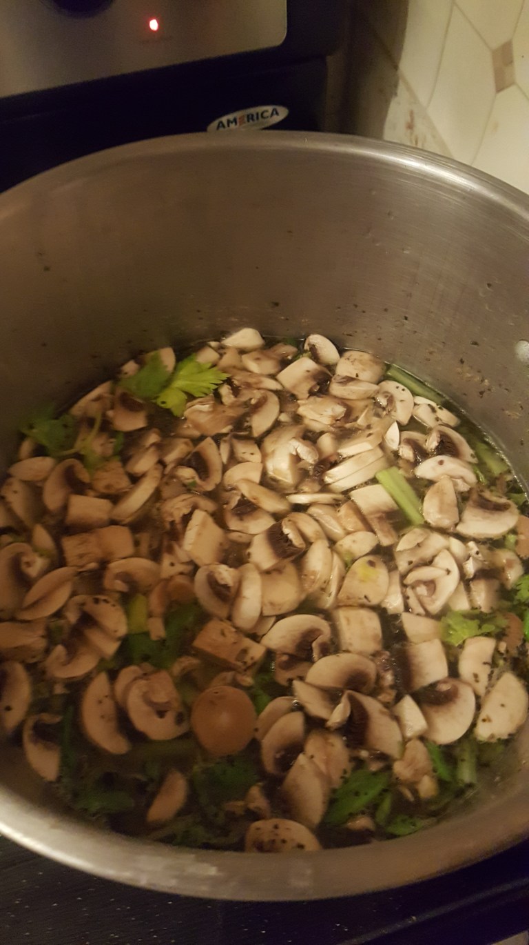 As soon as I take the chicken out I add my veggies. Carrots and celery are mandatory but you can add other things if you like we enjoy mushrooms as well. Cover it and bring it back up to a simmer. As for the skin I like to use it because it has a lot of flavor but it doesn’t break down very well. So what I will do is take the skin and a little broth and run it through my Ninja blender. I blend it until it is a liquid. I add all the shredded chicken and liquefied skin back to the soup. Bring it up to a simmer and season to taste.